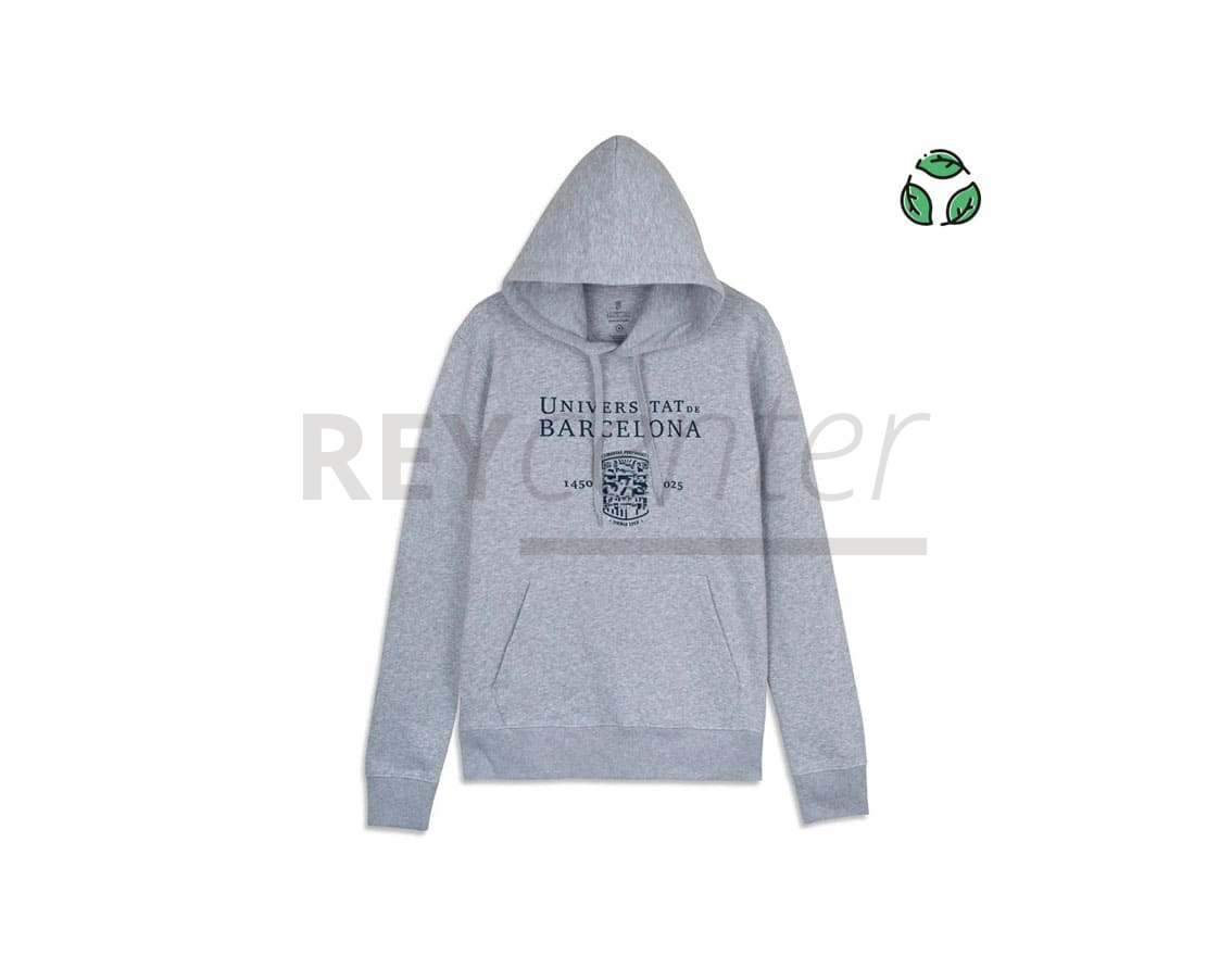Sudadera de color gris con capucha de doble tejido. Inscripción «Universitat de Barcelona · 1450-2025» y logotipo de los 575 años estampado en azul. Corte recto y modelo unisex.